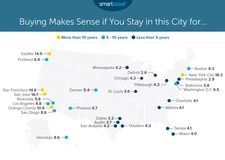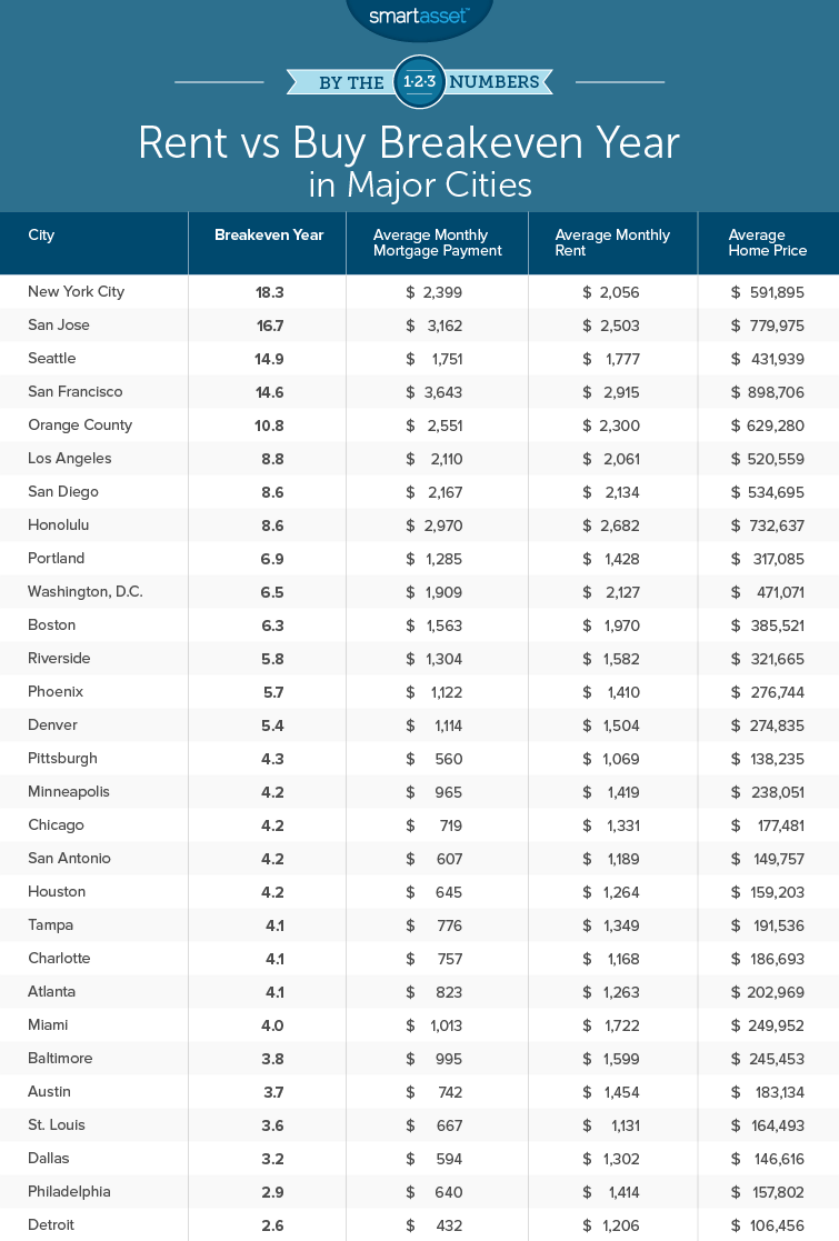 With that in mind, SmartAsset took a closer look at the data on renting and buying in the largest U.S. markets. We determined the breakeven point, the time it would take for a homeowner to recuperate those upfront costs of buying a home. (For more on our methodology, check here.)